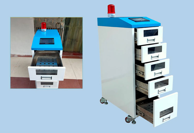 东虹鑫的自动回温设备大容量,自动快速回温,不间断回温解冻,比市面传统设备快4倍,生产效率提升100%,5层抽梯式+自动亮灯提示设计,移动方便稳固耐用,而且可以根据客户的要求,非标定制锡膏自动回温机器。