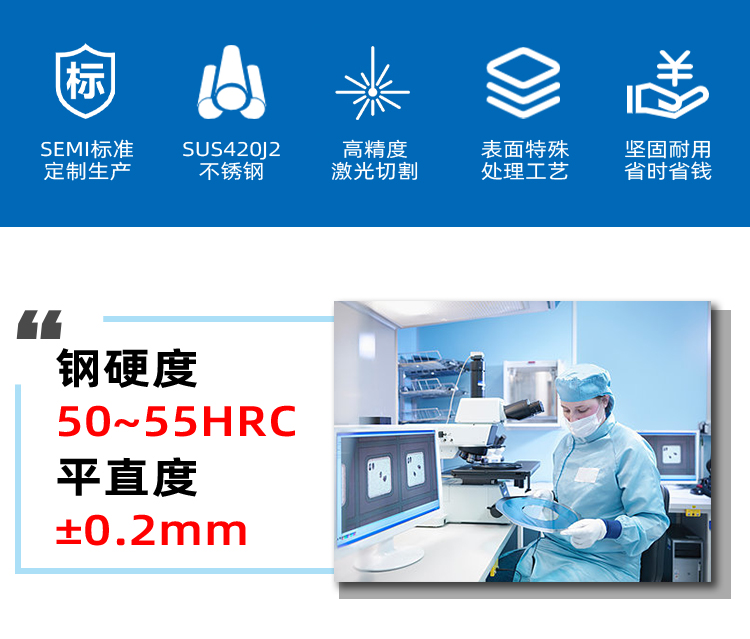产品简介: 产品编号:DSMTQB42-000-R0;12寸方形铁圈批发厂家东虹鑫拥有十多年的电子半导体行业周转存储系列产品生产经验,通过ISO9001质量体系认证,累积沉淀数百款晶圆铁圈产品长期应用于行业500强企业生产车间深受客户的好评与亲睐,我们的铁圈产品不仅精度和平整度高,而且光洁度和粘性也非常好与蓝膜贴附效不起泡,可以有效的帮助您提升产品生产加工效率。